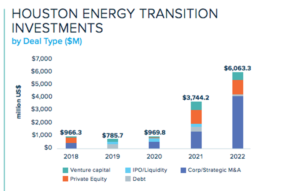 The report highlights the fact that last year Houston's energy transition brought in $6.1 billion in financing from private market investments, which represents a 61.9 percent increase compared to 2021.