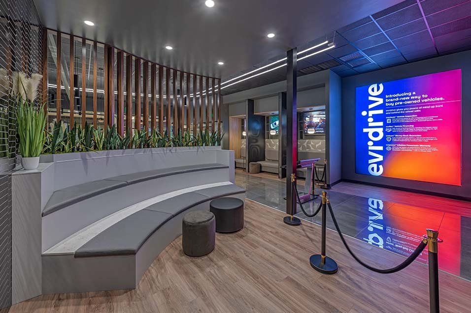 Designed by JLL Design Solutions, the modern space will allow shoppers to virtually tour the company's fleet of vehicles through its evrViewTM 3D hologram technology. According to a release, the technology can show evrdrive's full inventory of SUVs, cars, trucks, or other body styles and can display the vehicle's model specifications and history.
