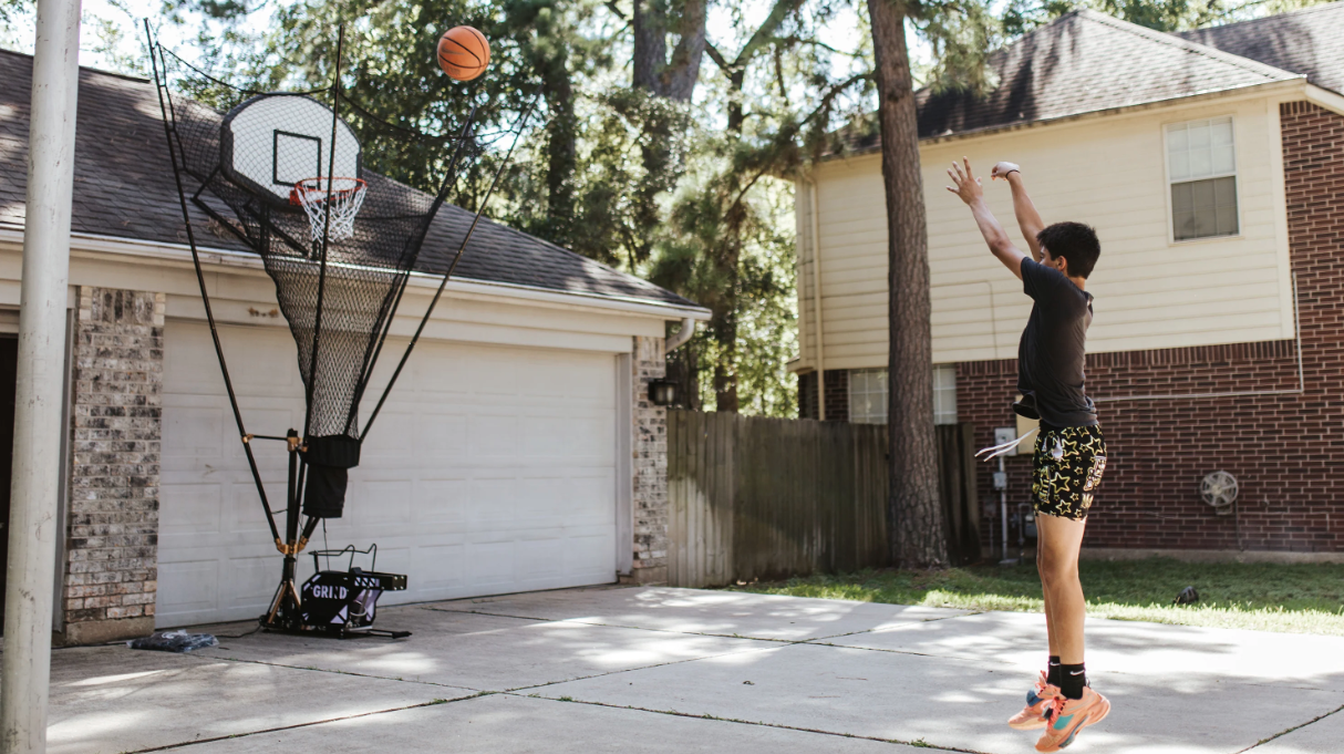 At just 110 pounds, the GRIND shooting machine is 54 percent lighter than other home shooting machines, has a 12-foot net, and needs just 90 seconds to set up or take down.