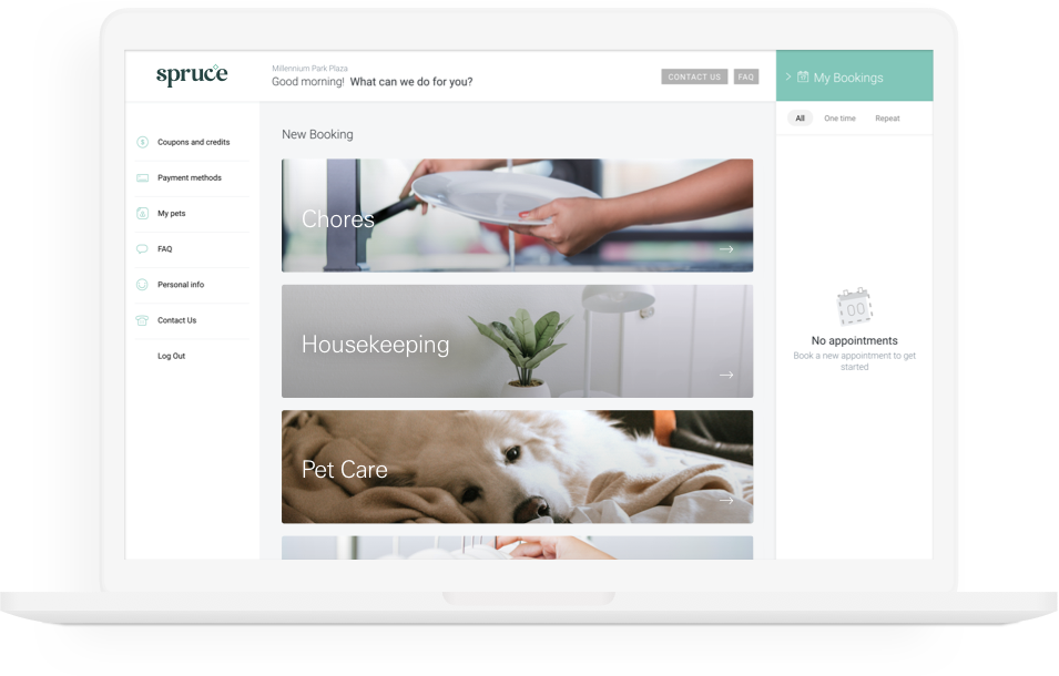 Spruce's services include daily chores, housekeeping, pet care (dog walking, pet sitting, etc.), and laundry and dry cleaning. Spruce has a B-to-B-to-C model in which it works with apartment communities to broker partnership deals to reach their residents.