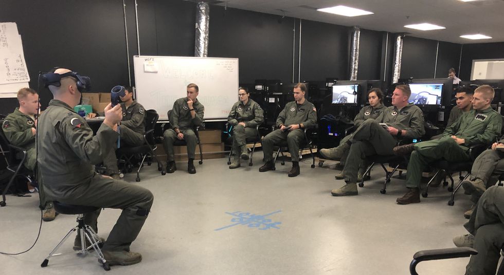 In a VR-based training session, participants are equipped with VR headsets and are plunged into realistic environments where they're presented with scenarios in which they, for instance, pick up a fire extinguisher and put out a blaze, or they land or eject from a military jet that's experiencing a problem such as an engine fire.